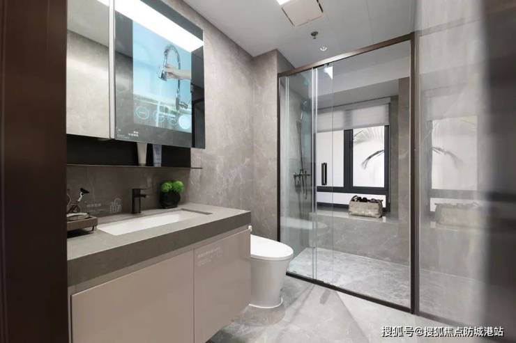 卫生间配备了灯带式组合镜柜,收纳空间充足;地柜悬空设计,预留了扫地机器人的插座;三联式卫浴门,更方便小孩和老人洗澡。