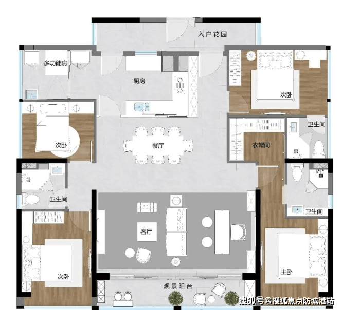 169-171㎡五房两厅三卫:双套房设计,带有入户花园和270度超广阔采光面,适合追求高品质生活的大家庭。