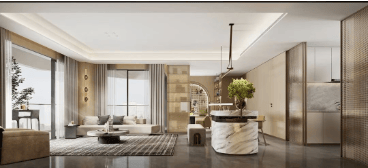 而在建面约180㎡的户型中,这个社交空间更是达到了约55㎡。从独立电梯厅进入玄关后,眼前是一个空中花园,可以设计喷泉、鱼池、奇石等,作为视觉缓冲区,对标顶奢酒店会所格调。这里不仅是家庭聚会的场所,更是商务私宴的理想之地。朋友们围坐在一起,举杯畅饮,谈笑风生,窗外的江景成了最好的背景板。
