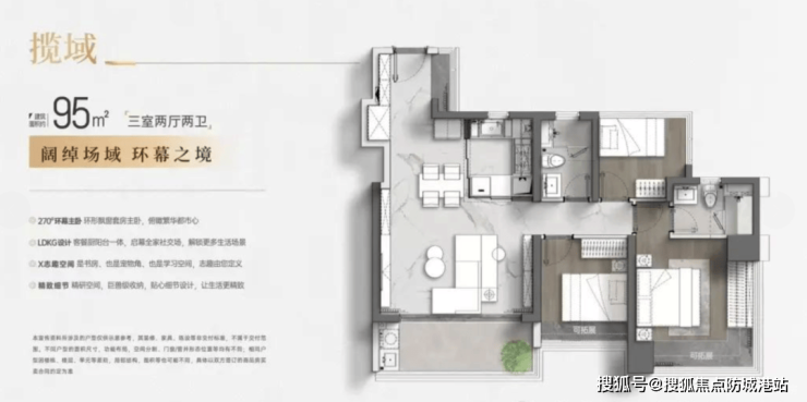 揽域 95㎡(三室两厅两卫):同样拥有 270° 环幕主卧套房,视野开阔。LDKG 设计使空间通透,增强互动性。设有志趣空间,可根据业主需求打造书房、宠物角或学习空间等,功能灵活多变。细节之处尽显品质,收纳设计贴心。