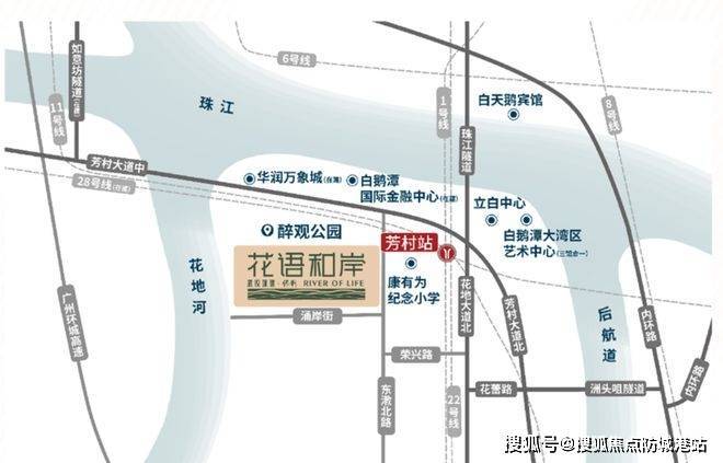 交通是这个项目的一大亮点。步行大约800米就能到地铁1号线芳村站(也就是白鹅潭站),这里未来会成为四线合一的超级枢纽:1号线已经运营,11号线已开通,22号线在建,28号线在规划中。这样的配置意味着未来出行可以实现多条线路无缝切换,0换乘直达广州站、广州南站甚至白云机场,通勤到主城区或跨区都很方便。除了地铁,周边还有花地大道和芳村大道两条主干道,3公里内接入珠江隧道、洲头咀隧道、如意坊隧道和东沙隧道等多条快速通道,连接内环和环城高速,驾车去珠江新城或金融城半小时左右就能到。想体验滨水休闲的,项目1公里内有芳村码头,水上巴士S2线直达中大和广州塔,S6线连通海珠区和老荔湾黄沙,闲时坐船游江特别惬意。