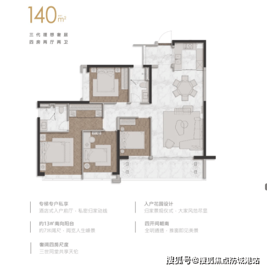产品设计亮点包括地上地下双落客大堂,配备 10.8 米挑高星级酒店式中空大堂;专属私密电梯配置,实现独户阳光电梯尊享体验。多数户型采用东南北三向观景设计,可直望白云山景观,最大化自然视野。