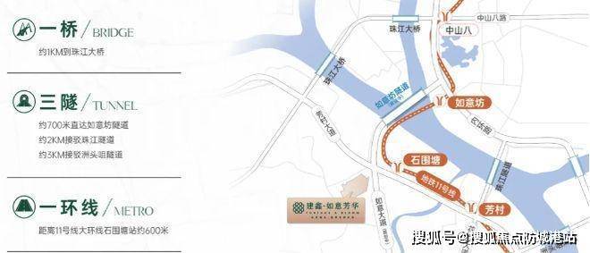 贰:便捷的交通带来的体验交通出行十分便捷,步行约 600 米就能抵达 11 号线石围塘站,这条被誉为广州首个大环线的地铁线路,途径多个中心区,拥有多达 14 个换乘站,让您轻松换乘多条地铁线路,畅达全城。1 站如意坊可换乘 6 号线,1 站芳村能换乘 1 号线 / 22 号线(建设中),2 站中山八可换乘 5 号线,直通珠江新城,无论是日常通勤还是出行游玩,都能高效实现。自驾方面,项目紧邻芳村大道,通过洲头咀隧道、内环路等,可快速通达天河、越秀等城市核心区。未来如意坊二期高架道路建成后,出行将更加便捷顺畅,为您的生活与工作带来极大便利。