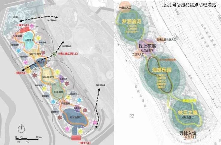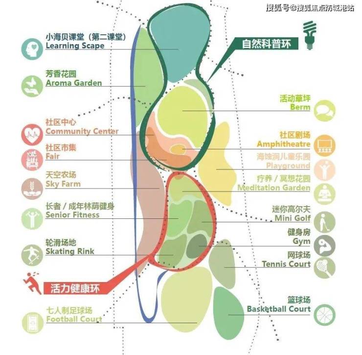 “两环一心八景”多元活力配套:儿童自然科普课堂、海蚀洞儿童乐园、迷你高尔夫球场;芳香花园、社区农场;篮球场、足球场、网球场、轮滑场所、林荫健身等复合型配套
