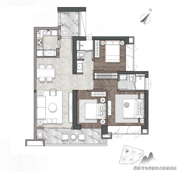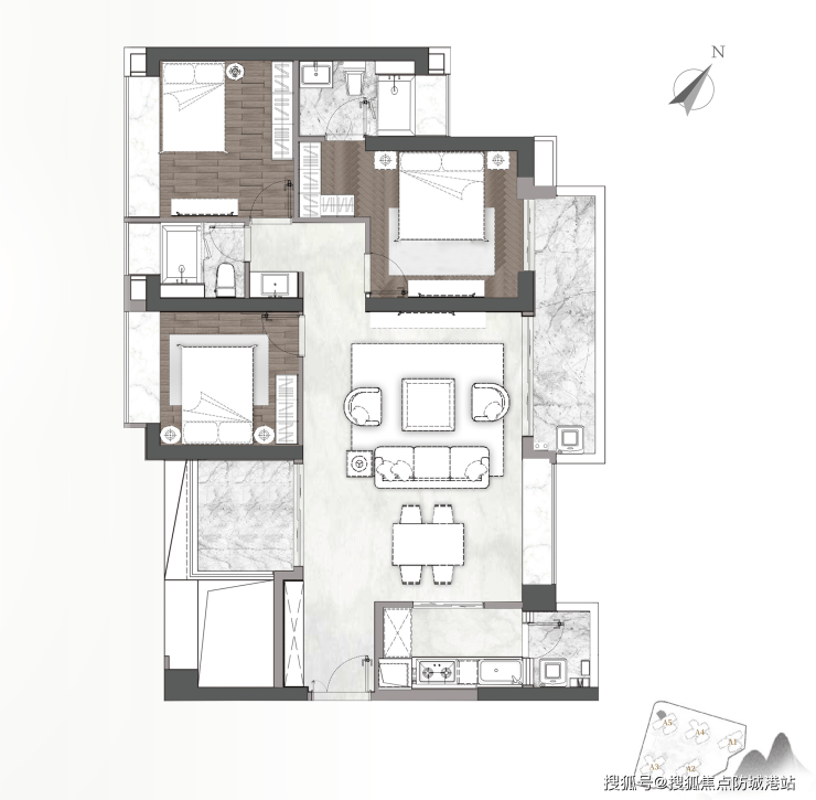 - A5-04/05户型:建面约140㎡3+1房两厅两卫,灵动多功能空间,可改造书房、儿童房,满足多孩家庭与居家办公需求,阔景阳台尽享云山风光。
