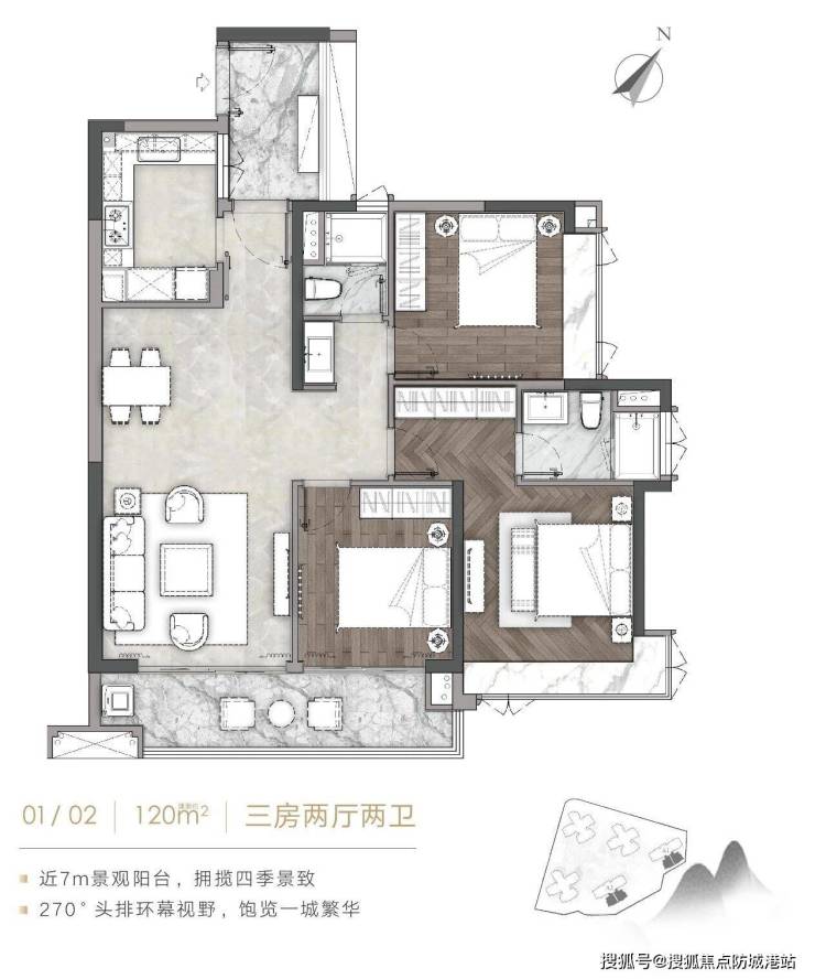 - A1-01/02户型:建面约120㎡三房两厅两卫,全明通透,动静分区,阔景阳台揽山入怀,主卧套间带独立卫浴,满足三口之家舒适居住需求。