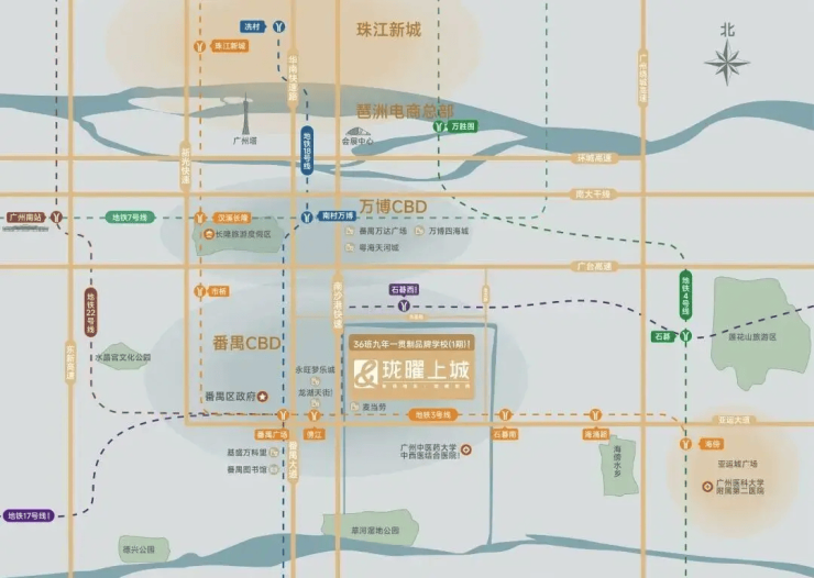 广州地铁珑曜上城距3号线石碁南站仅500米(直线距离),步行8分钟可达。从项目出发: