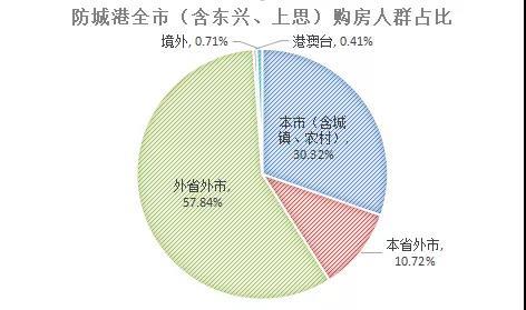 与此同时,房协还公布了一组上半年在防城港购房群体来源分析数据,数据显示,本市购房人群占比为30.32%,本省外市的购房人群占比为10.72%,外省外市购房人群占比为57.84%,港澳台占比为0.41%,境外购房人群占比为0.71%。