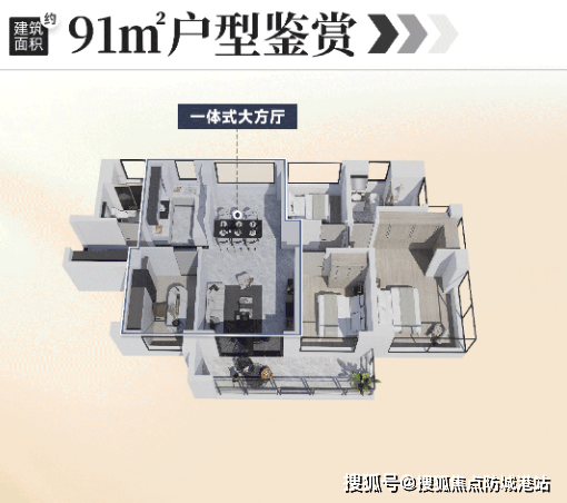 91㎡四房户型,尺度堪比120平以上的大户型,配备约6.3米南向阳台,横跨客厅和卧室,可开辟第二客厅、花园、茶室、健身区等,满足家庭成员闲适时的“拥园揽景”需求;豪华主卧套房借鉴140平户型思路,单边位+卧卫错开,并引入270°环幕景观,窗外繁华城景尽收眼底,适合追求居住舒适度的首改家庭。