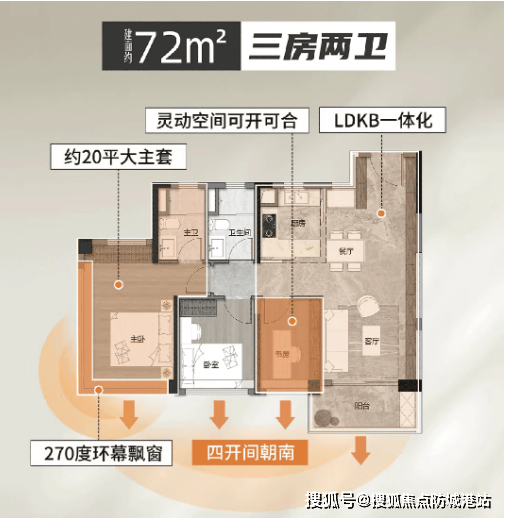 72㎡三房两卫:天河罕见的最小面积双卫三房,全卧室南向+四开间朝南,功能相当于传统90㎡产品;