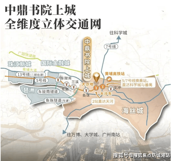 中鼎书院上城坐落于老黄埔大沙地板块,这里是区域内发展成熟、宜居宜业的核心地带。交通出行极为便捷,从项目步行约 800 米即可抵达地铁 5 号线大沙地站,无需公交或电动车接驳,2 站直达三溪,无换乘便能轻松抵达金融城与珠江新城两大核心商圈;同时,7 号线二期大沙东站已开通,进一步拓宽了出行版图。此外,项目北边紧邻广园快速,南边靠近黄埔大道,两条快速路贯穿广州东西,自驾通勤同样高效。更值得一提的是,项目处于广州第二 CBD 核芯区域,受金融城、琶洲、珠江新城三大核心辐射,尽享黄金三角发展红利,未来潜力无限。
