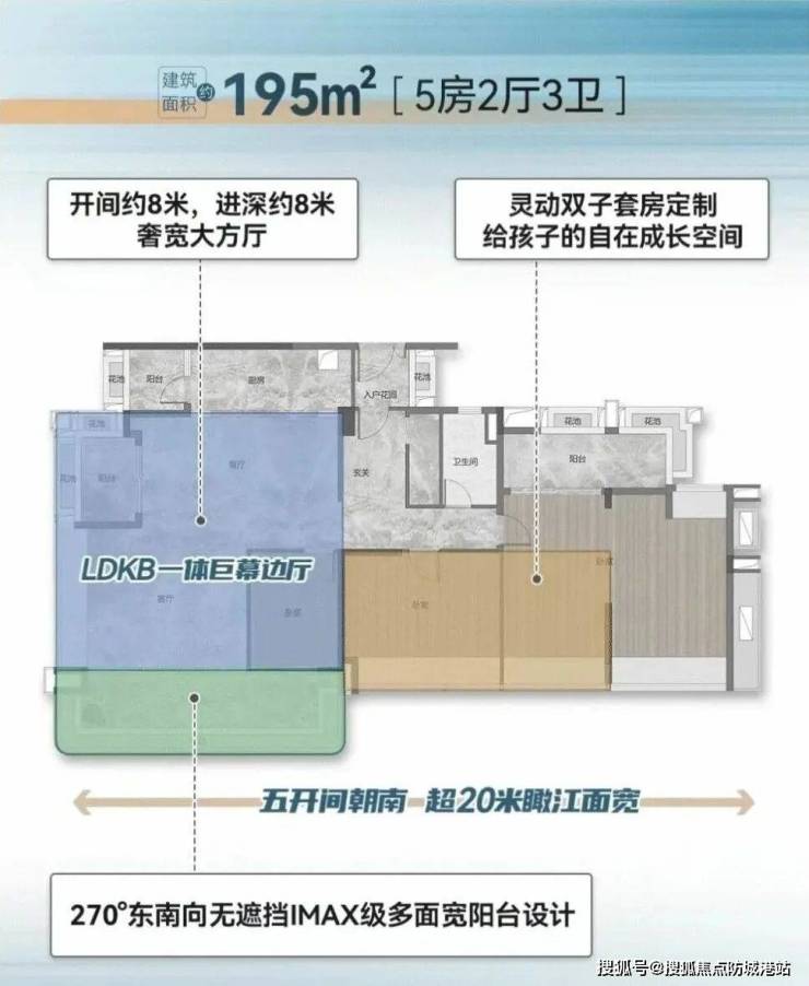 建面约195㎡江景大平层(顶豪):五开间南向,一体化巨幕客厅面积达55㎡,LDK客餐厅连通8米景观阳台,总价近1800万元。