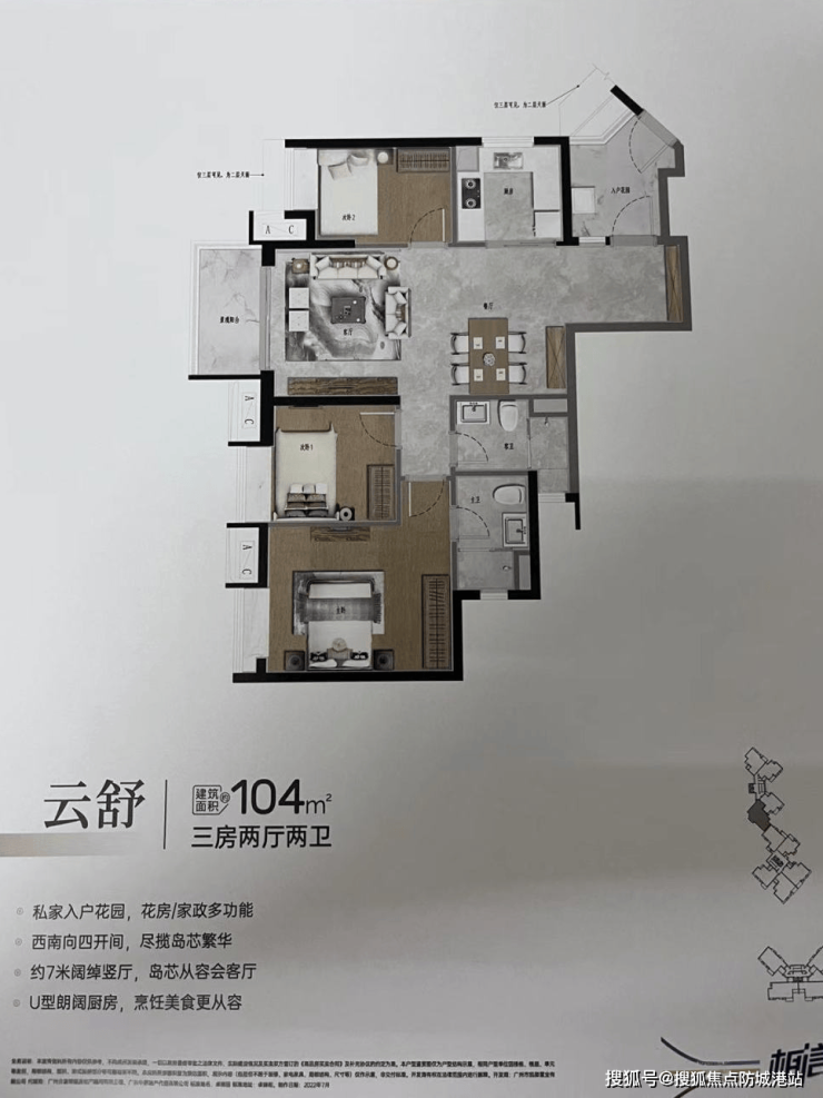 104㎡大三房:采用飞机户型设计,虽然入口处有一定面积浪费,但总体来说较为实用。