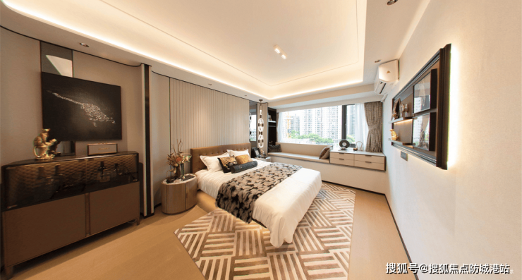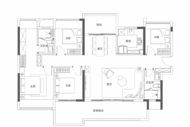 建面约140㎡四房户型:该户型是项目全区至安静的户型之一,直面大山乸森林公园苍翠山景,真正实现“枕山而居”。户型采用南北双阳台设计,南向约9.2米超大阳台,视野开阔,可瞰山观园;次卧也引入绝佳观景体验,让自然美景融入生活。客厅采用LDKG一体化设计,打造城市云端私人会客厅,为家庭聚会、朋友宴请提供充足空间。主卧套房做到南北对流,面积约24㎡,配置步入式衣帽间与独立卫浴,180°环幕大飘窗让一线山景迎面而来,尽显豪宅阔绰感。户型创新采用“飞机户型”设计,各卧室分布合理,年轻人卧室活动不影响长辈休息,保持亲情舒适距离。长辈房空间充盈,可轻松容纳1.5米双人床、衣柜及床头柜,且靠近公卫,动线缩短,近乎套房体验,充分考量长者起居需求。