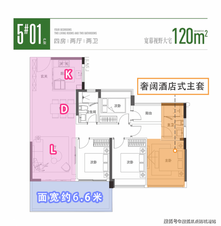 建面约120㎡阔绰四房户型:该户型采用四开间朝南的全明格局,采光优越、通透舒适。南向长约6.6米的景观阳台,不仅拓宽了生活空间,更将园林美景与自然风光尽收眼底。约18㎡行政式主卧套间,可打造独立衣帽间和独立卫浴,空间尺度与生活尺度追平140+㎡户型,为业主提供高品质的居住体验。各功能区布局合理,动静分离,兼顾生活便利性与私密性。
