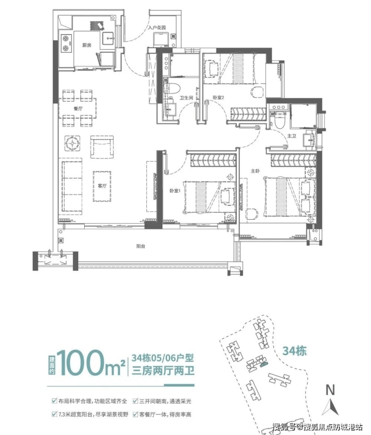 建面约100㎡瞰景大三房,约7.3米超宽阳台,以宽阔的光照面,大幅度迎入阳光,湖园美景尽收眼底。而南向主卧,尊享独立明卫,以超大观景飘窗,自成一方私密天地 ,每天惬意享受清风与阳光。