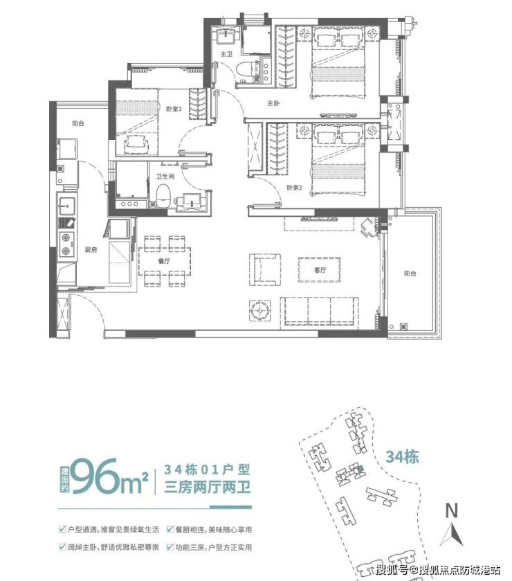 建面约96㎡滨水舒适三房,餐客厅一体化,连通观景阳台,臻藏生活美景,客厅与休息区以科学合理的布局分隔,动静皆从容,卧室均规划大面宽飘窗,放大房间尺度感,营造舒适生活体验。
