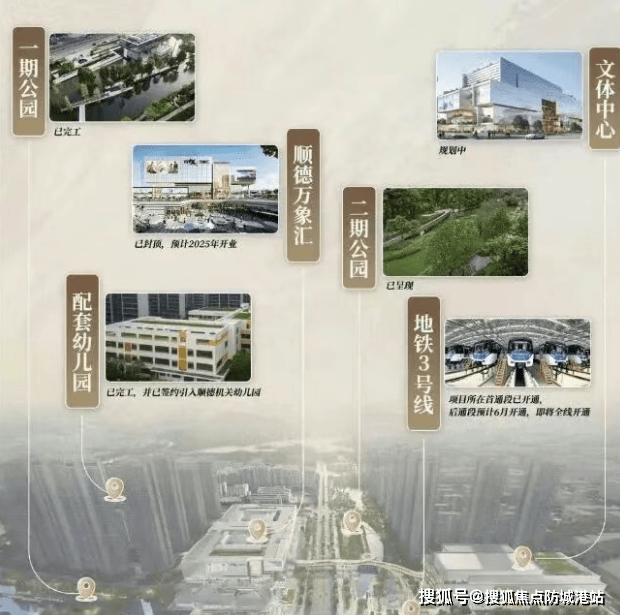 主要业态:包括超13万㎡的顺德万象汇购物中心、3.5万㎡的文体中心、约6万㎡的滨水景观公园及18班幼儿园等。