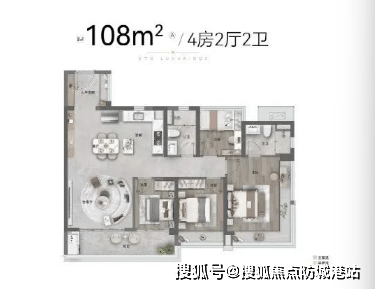 约108㎡四房两厅两卫:高得房率、中央空调、精工厨房及全屋收纳系统,兼顾二孩家庭实用性;