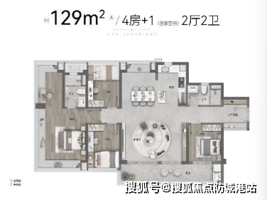 约129㎡四房+创意空间:五开间朝南,双开间宽幕阳台、三面采光,视觉纵深感突出,居住舒适性媲美中心区豪宅。