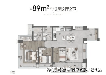 约89㎡三房两厅两卫:高配入户花园、独立卫浴主卧套房、270°飘窗及阔景阳台,满足三口之家使用需求;