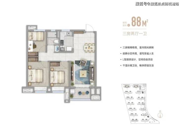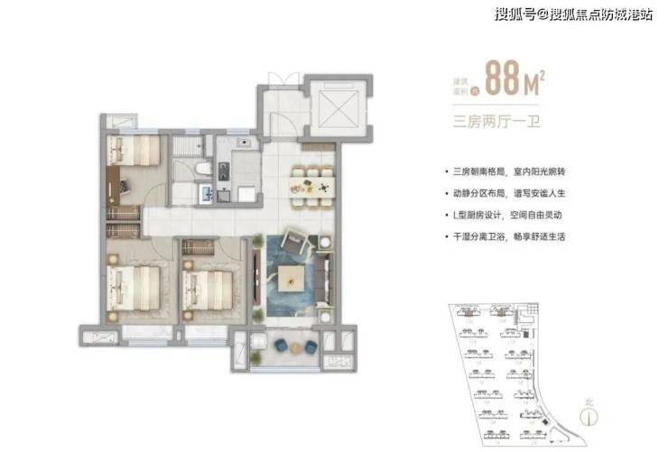 【88平米三房两厅一卫】三房朝南格局,独梯入户,室内阳光婉转;动静分区布局,谱写安谧人生;L型厨房设计,空间自由灵动;干湿分离卫浴,畅享舒适生活