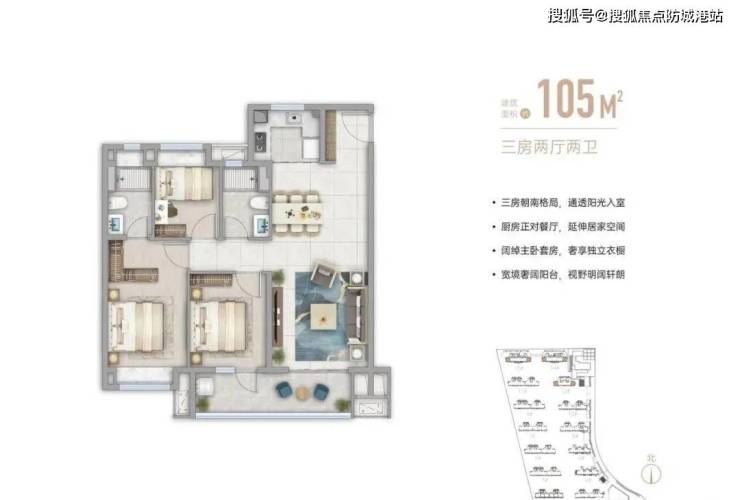 【105平米三房两厅两卫三房】朝南格局,通透阳光入室;厨房正对餐厅,延伸居家空间;阔绰主卧套房,奢享独立衣橱;宽境奢阔阳台,视野明阔绚烂