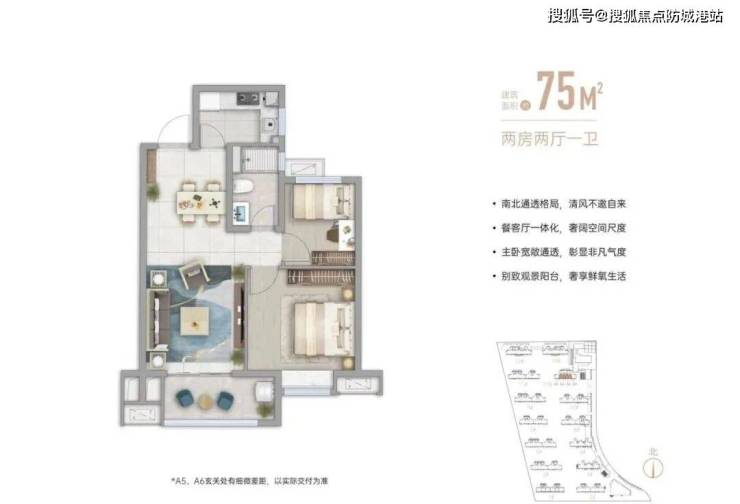 【75平米两房两厅一卫】南北通透格局,清风不邀自来;餐客厅一体化,奢阔空间尺度;主卧宽敞通透,彰显非凡气度;别致观景阳台,奢享鲜氧生活