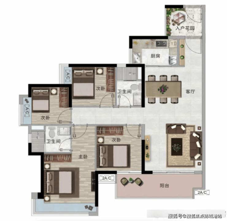约 126 - 138㎡户型:南北通透,双阳台设计,主卧约 270° 转角飘窗,南向约 6 米大阳台,居住体验舒适。