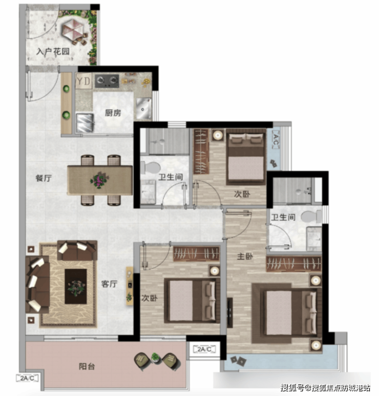 约 101㎡户型:带入户花园,南向约 5.4 米瞰景阳台,主卧约 270° 转角飘窗,居住舒适度高。