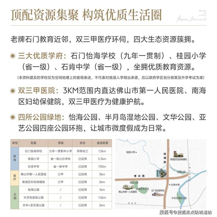 小学有镇安小学、环湖小学、铁军小学等省级重点小学,其中环湖小学是佛山知名公办小学,教学质量稳居禅桂前列;初中有华英学校、佛山三中初中部、南海实验中学等,均为佛山顶尖公办初中,升学率常年位居区域前列。所有学校均为政府公办,学区划分以当年教育局公示为准,项目仅做空间地理表述,不做入学承诺,但密集的优质教育资源,无疑为孩子上学提供了更多选择。