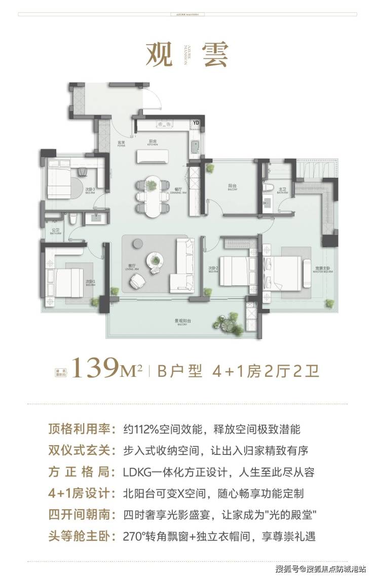 这款户型是项目爆款,使用率高达 112%,实际使用面积超 155㎡,四开间朝南,全明户型。同样采用 LDKG 一体化设计,客餐厅约 40㎡,搭配 7.5 米南向阳台,270° 观景视野,园林美景尽收眼底。双阳台设计,南向观景、北向家政,功能分区明确;4+1 房布局,可改造为五房,满足三代同堂、多孩家庭需求,每个房间都宽敞明亮,没有局促感。主卧 35㎡行政套房,带独立衣帽间、双台盆卫浴,尊享私密生活。