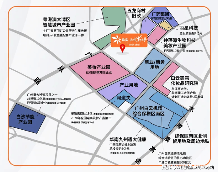 珠实云悦花语坐落在白云区东北部的钟落潭,这里不仅是千亿级美丽健康城的核心地带,也是白云大学城的重要组成部分。项目周边汇聚了何济公、明兴制药、广药集团等29家知名健康产业企业,以及仲恺农业工程学院、广东白云学院等13所高等教育院校,共同构成了一个集医药研制、职业教育、健康服务和健康养生四大功能片区于一体的综合性区域。珠实云悦花语总占地面积约8.5万平方米,建筑面积约22万平方米,规划有约2130户住宅单元,绿化率高达35%,旨在打造一个宜居宜业的城市生态住区。