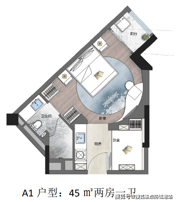 A3户型:约54㎡,动静合理布局,利用率高,小尺寸大容量,简约时尚,流畅双厅设计,通透舒适。