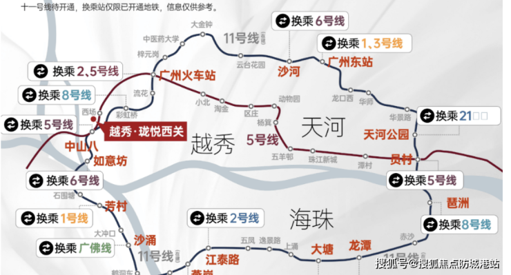 项目交通便利,距离地铁5号线及11号线交汇的中山八站约一公里,步行可达5号线及13号线二期西场站,通勤效率极高。11号线作为广州城市首条环线,直达天河、琶洲、白鹅潭等城市核心区域,极大缩短了日常出行时间。5号线更是市区通勤主力干线,可快速连通珠江新城及东部产业带,无论是生活、工作还是休闲出行,均可一线贯通。即便后续换乘,站点设计也使得转线次数最少,换乘成本低,通勤压力小,为高频出行人群带来极大便利。