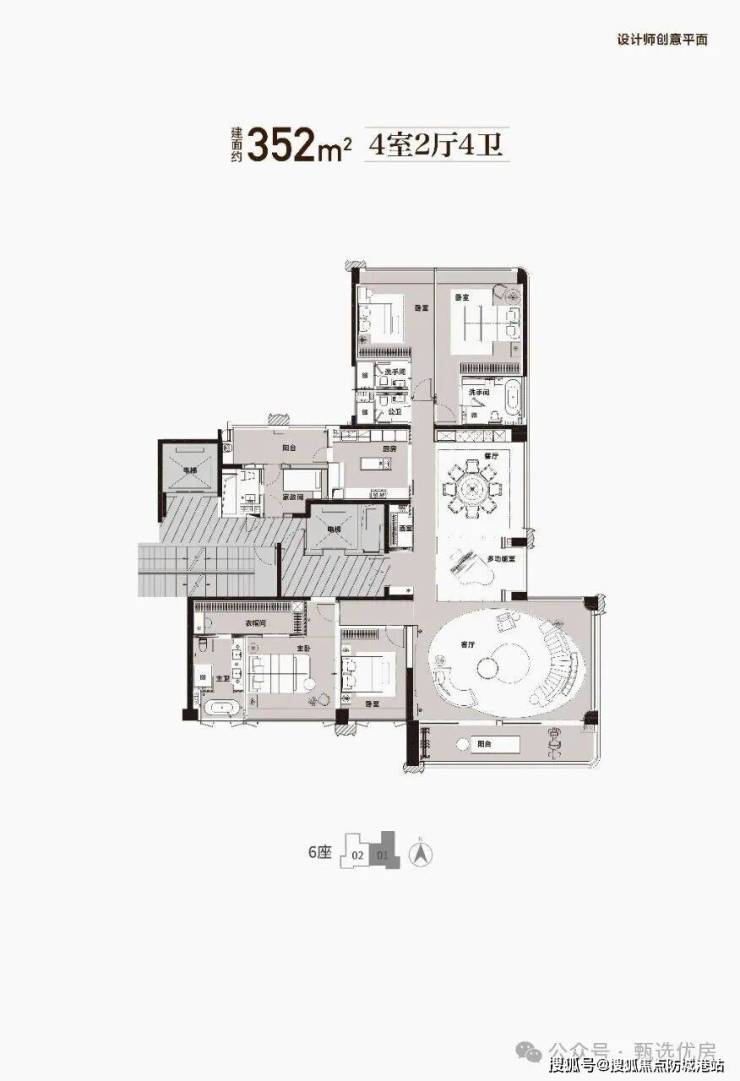 6座01户型 建面约352㎡|东南单边无遮挡,三面采光全景视野,三梯两户尊贵归家仪式
