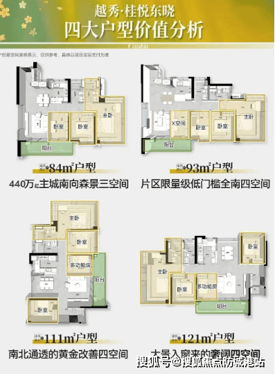 户型设计是越秀桂悦东晓的一大亮点,完美诠释了“超新规、全南向、公园景舱”的产品力。项目所有户型均采用全南向或东南、西南朝向,确保了最佳的采光与通风效果。建面约84㎡的户型,拥有四面宽朝南设计,卧室全南向,搭配360°无遮挡飘窗,享无柱阔绰观景舱;建面约93㎡的户型,更是做到了稀缺的五开间四卧全南设计,拥有约5.3米270°景观阳台,直面晓港公园全景;建面约111㎡的东南向对流户型,高区可瞰江景、广州塔、二沙岛及珠城CBD,拥有双面宽长跑道大阳台;建面约121㎡的终极改善户型,更是配备了入户800库收纳间和独立步入式衣帽间,主卧拥有360°环幕公园景观。所有户型均采用LDKB一体化设计,餐厅中心化,开放式厨房与餐桌互动,满足全周期家庭需求。