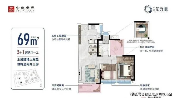 产品:项目总体南低北高,保证日照需求,蝶形设计,保证户户朝南,围合式布局,保证户户望园林。中建星光城分两期建设,目前在售69㎡-100㎡户型。