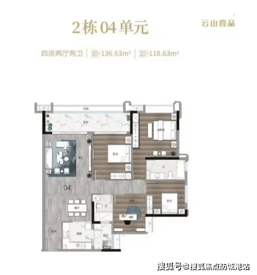 164㎡四房两卫:奢阔尺度,双主卧配置,独立家政区,满足多代同堂或高阶生活所需。