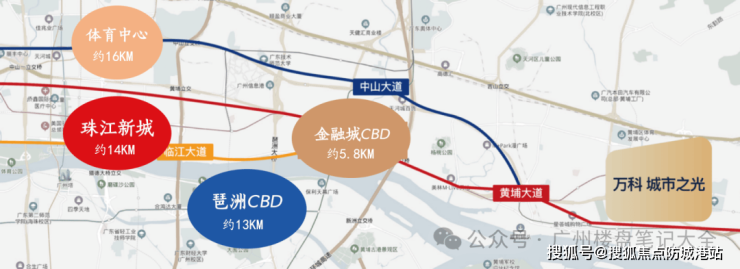 黄埔大道、中山大道、临江大道:项目紧邻黄埔大道、中山大道、临江大道,直通珠江新城、琶洲、国际金融城等核心区。这些主干道构成了项目通往全市各地的交通大动脉,快速连接金融城、琶洲、珠江新城三大CBD。