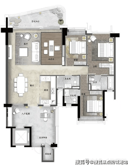A户型(约270㎡):环幕江景四房,9米超大邮轮式阳台,一线望江无遮挡,专梯专户,墅级空中双花园,多功能空间,主卧面积达42㎡,270°环幕江景,阔绰双主套房设计。