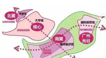 越秀大学城和樾府位于大学城二期 —— 国际创新城板块,这片规划面积达十平方公里的区域,是官方定位的 “大学城 2.0 版本”。板块空间结构上形成 “一核两翼” 的格局,北翼为生物岛,核心为大学城,南翼则涵盖南岸起步区、南村、化龙地区以及国际展贸城。