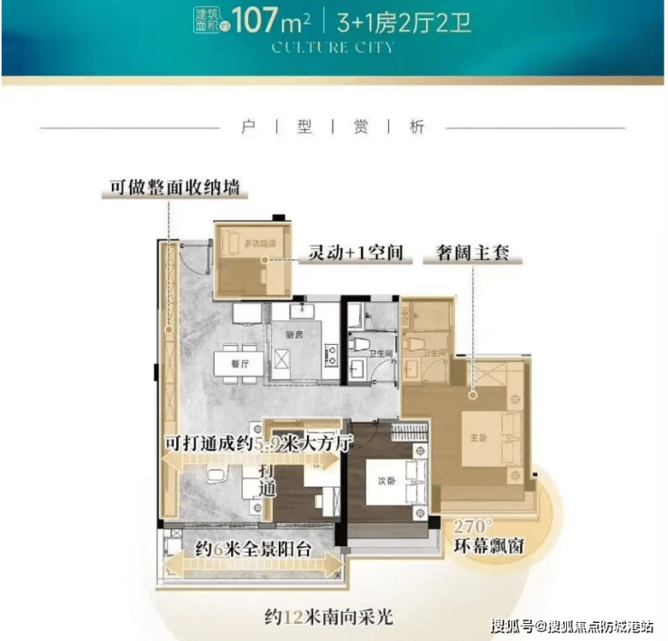 建面约107㎡四房:拥有12米南向采光面,通透LDK一体化设计,约6米奢阔阳台,且带有独立入户花园。三房两卫布局,主卧带独立卫生间,次卧和书房尺度适中,三面下床是标配,还能放下衣柜和书桌。层高做到约3.1米,领先同行一个代际。