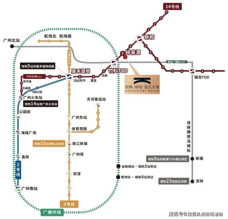 1 地铁:14 号线钟落潭地铁站直线距离约 850 米,5 站直达白云新城,1 次换成天河芯 2 城轨:新白广(建设中);广佛环线北段 2TOD:坐享竹料、镇龙两大 TOD 红利,畅享湾区生活 4高速:广园快速路、G4 京港澳高速、机场高速、花莞高速(金盆至仙村互通立交段已通车) 近享 CBD 生活圈:直线距离约 23.9km 直达白云新城、直线距离约 28.1km 直达珠江新城