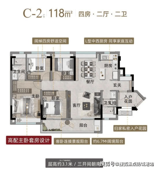 花语天宸主推建面约97-168㎡三至四房精工现房,全部实现全南向布局,并以多项“板块唯一”配置树立产品标杆:
