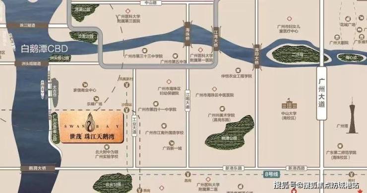 8. 世茂天鹅湾位于广州海珠区城央核心,处于海珠与荔湾、天河的交界地带,将多区优质生活圈尽在掌控。向东通过便捷交通可达琶洲CBD,享受国际会展与数字经济资源;向西连接荔湾老城区,感受上下九等商圈的历史底蕴与岭南风情;向北跨越江面向达天河珠江新城,畅享广州最核心的金融、购物资源。项目所在的滨水地带,既承接了海珠的生态与创意资源,又辐射了荔湾的文化与天河的商业,形成“工作在天河/琶洲、生活在滨水、休闲在荔湾”的跨区生活模式。住户可在半小时内切换于不同城区的优质资源间,真正实现“一套物业,坐拥多区繁华”的湾区生活体验。