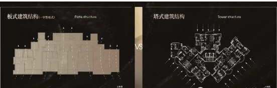 户型设计是本项目的一大亮点。项目经过上百次方案比对,最终采用纯板式方案,所有户型一字排开,100%南北对流,几乎所有的户型都是三开间及以上朝南,对比塔楼具有明显优势。板楼设计使得户型间不存在遮挡,容易产生对视的问题得以避免,室内空气流线好,换气效果极佳,真正实现真正的南北通透,全明采光。