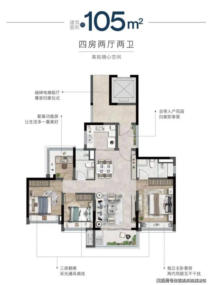 104㎡四房:四开间朝南,自带入户花园,实测得房率89%,适合三代同堂家庭。