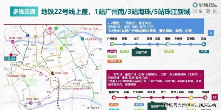 星瀚TOD的交通配套十分便捷。项目位于地铁22号线陈头岗上,2站可到广州南站,在此可换乘2号线;3站能到达番禺广场,进而转乘3号线和18号线,虽然到珠江新城需换乘一次,但未来快线开通后约33分钟即可抵达。22号线未来规划更是向北串联白云机场、白云站、广州火车站,南延至庆盛站、蕉门、南沙客运港,并跨海连接东莞,最终与深圳地铁18号线对接,将广州、东莞、深圳三大城市紧密相连。此外,项目南侧的南大干线采用双向八车道设计,时速达80公里且无红绿灯,串联多个重点发展板块;北侧的东晓南放射线双向六车道,时速80,能快速将广州南站客流量接驳到市区。小区内还设有专门的社区接驳车,方便业主在地铁口与小区之间往返,极大地提升了出行的便利性。售楼处电话: 提供购房咨询的联系方式4008285661