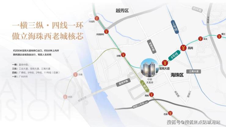 项目距离地铁8号线宝岗大道站C出口仅150米,步行2分钟即可到达,真正实现“地铁口旁的家”。通过8号线可快速换乘广佛线、2号线、3号线等多条地铁线路,便捷通达广州各个区域:约15分钟直达荔湾陈家祠(6站),感受岭南文化底蕴;转2号线约15分钟直达海珠广场(4站),尽享城芯繁华;约20分钟可达天河珠江新城(7站),便捷对接商务核心区,满足通勤需求。